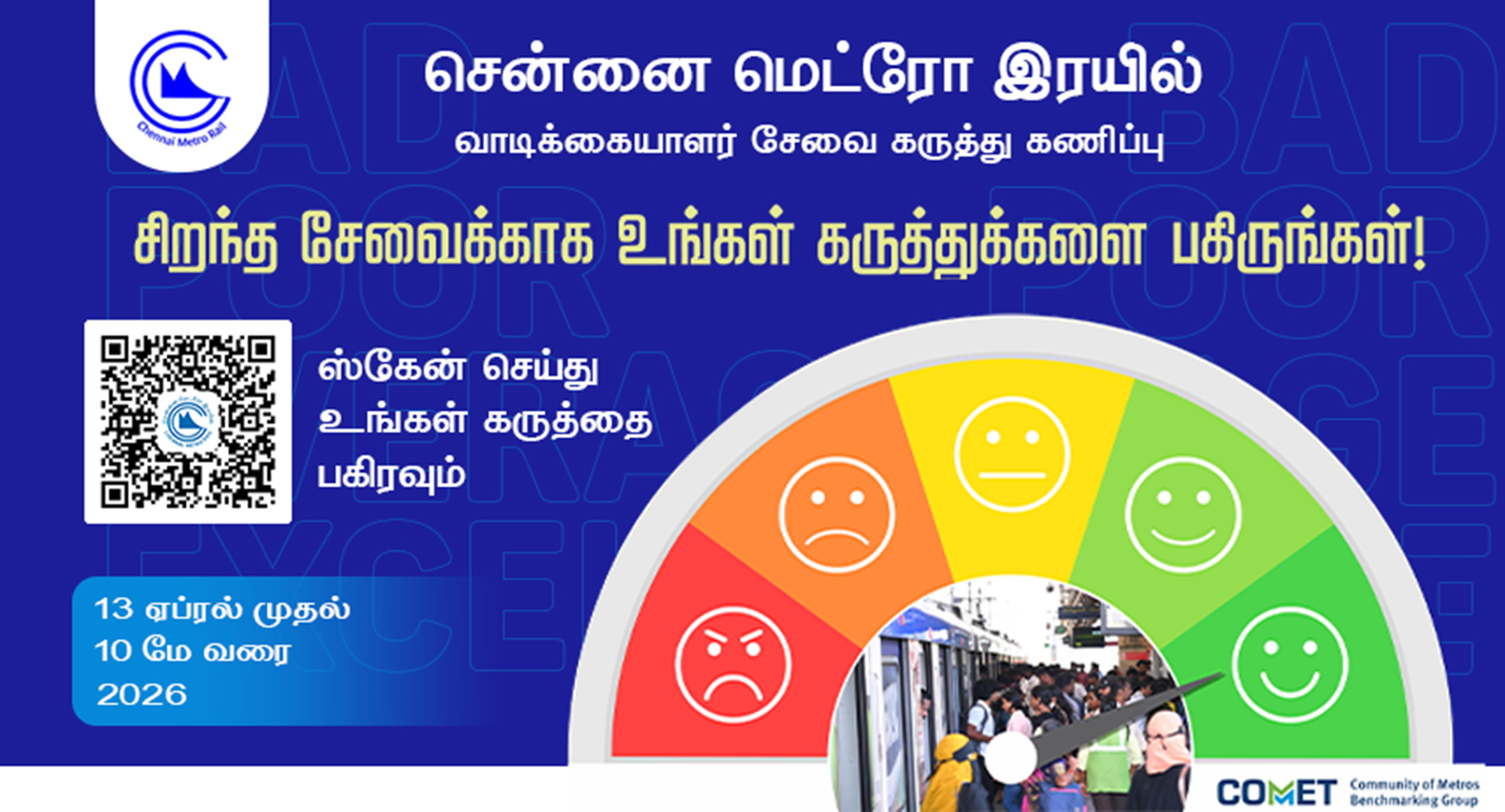 அன்பார்ந்த பயணிகளே, “சென்னை மெட்ரோ ரயில் நிறுவனம் – வாடிக்கையாளர் சேவை கருத்துக்கணிப்பு – பங்கேற்க இங்கே அழுத்தவும்“